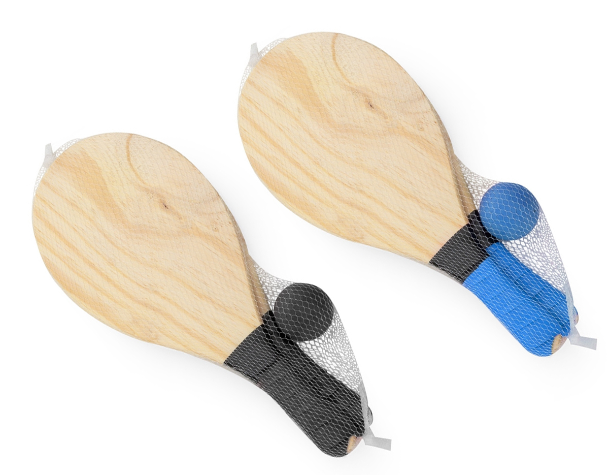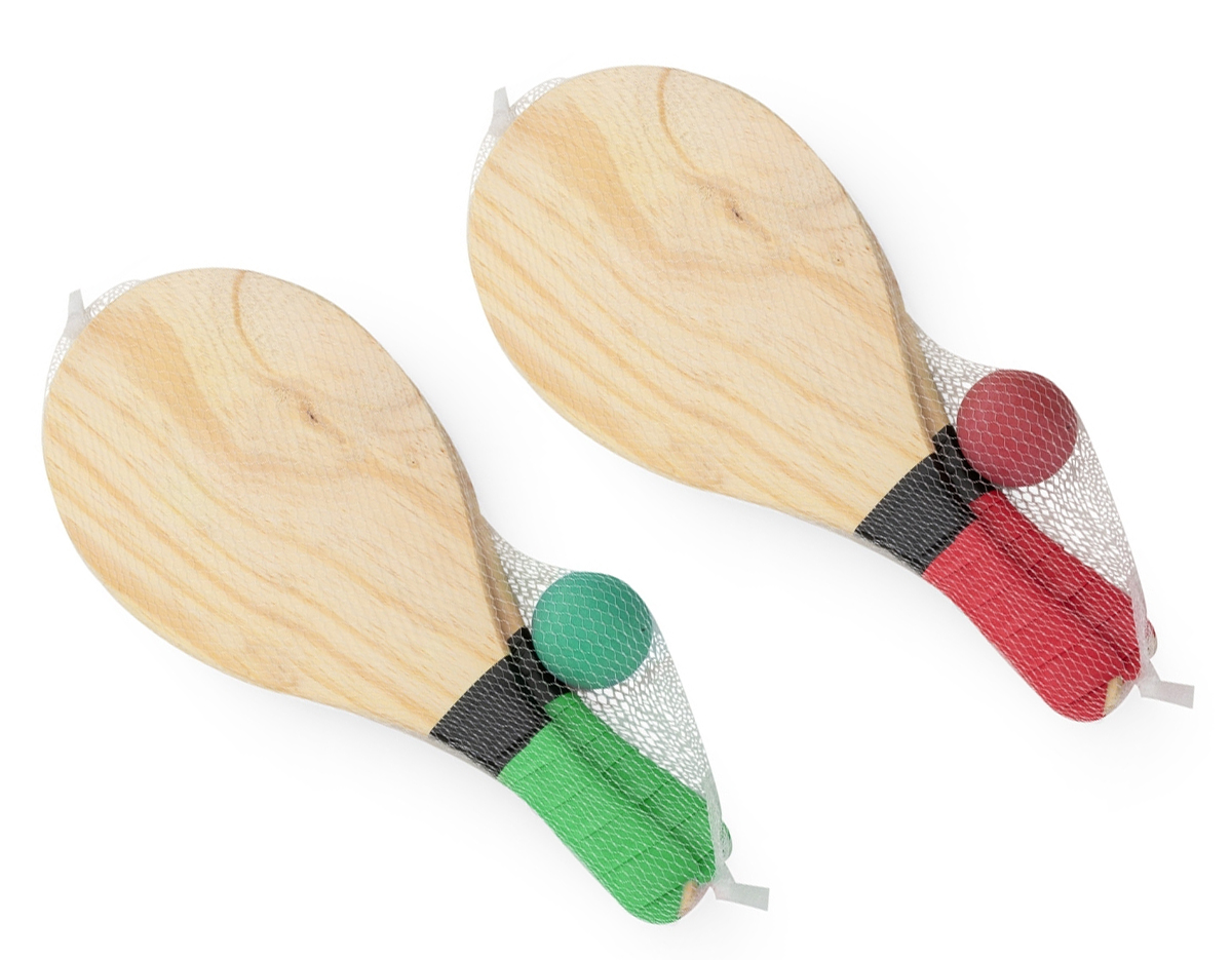 Raquetes de praia confeccionadas em MDF, acompanhadas de uma bola, são perf...